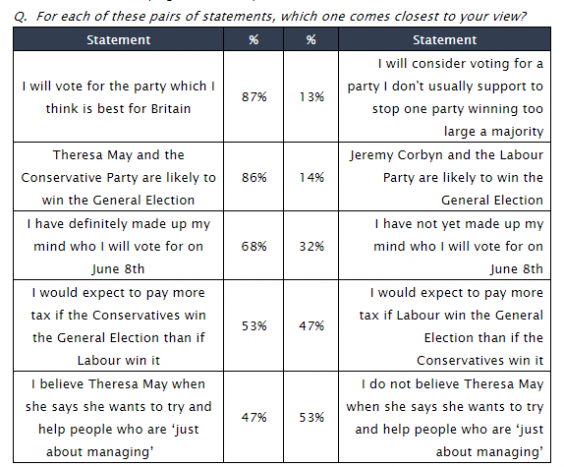 It found that most voters – 53 per cent – “do not believe Theresa May when she says she wants to try and help people who are ‘just about managing’”; 47 per cent say they do believe her. And with less than four weeks to go to polling day a third of voters – 32 per cent – have yet to make up their minds how to vote.
