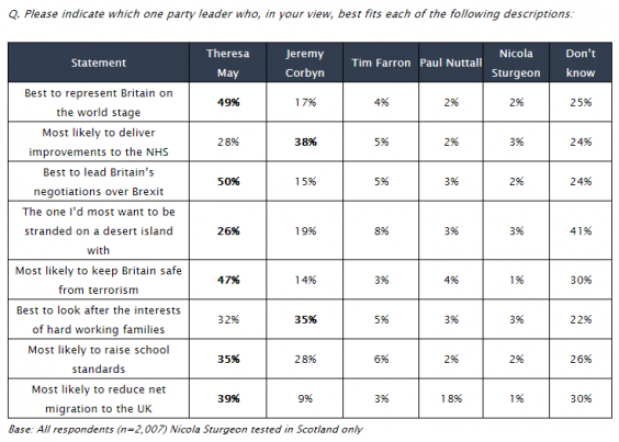 Ms May, who on Tuesday appeared on BBC1’s The One Show with Philip, her husband, also won the “desert island” test, with 26 per cent saying she was “the one I’d most want to be stranded on a desert island with”: 19 per cent opted for Mr Corbyn; 8 per cent preferred Tim Farron, leader of the Lib Dems; 3 per cent Mr Nuttall; and 3 per cent – 40 per cent in Scotland – Nicola Sturgeon, leader of the SNP. But 41 per cent did not want to be stranded with any of them.