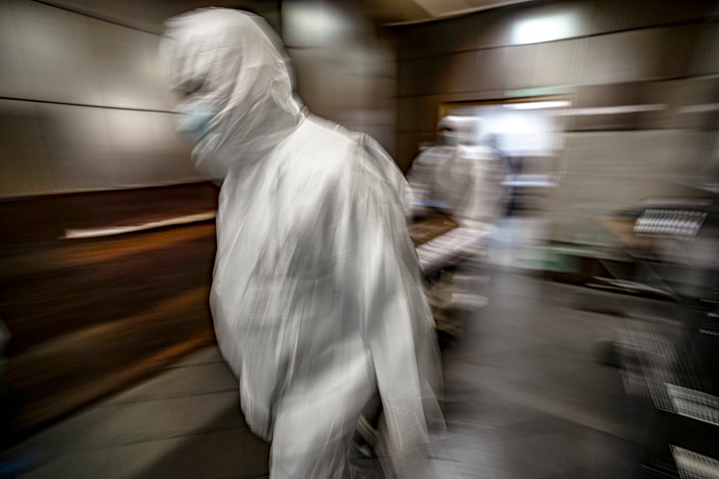 At the hospital, even an emergency waiting room has been converted into a COVID-19 area, sealed off by a plastic sheet. On the days when admittances run high, newly-arrived patients have been forced to lie on stretchers in the corridors before they can get a bed.