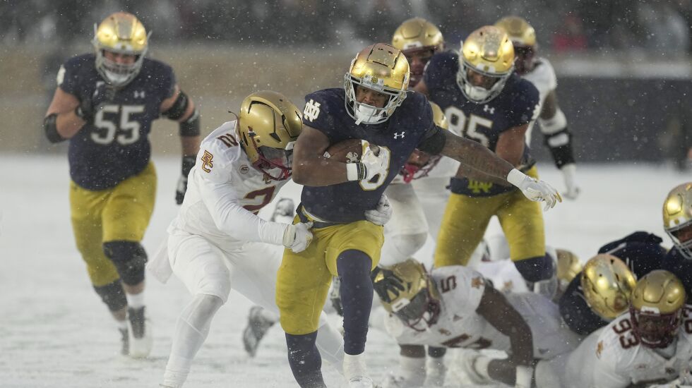 He won’t like what he sees. Notre Dame dominated from the start, with Logan Diggs breaking through the line untouched for 51 yards before being tackled at the BC 24-yard line. The Irish settled for a 26-yard field goal by Blake Grupe.