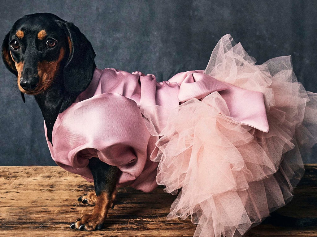 Elsewhere there is a tight-fitting fuchsia jacket. which is modelled on a miniature dachshund in the campaign.
