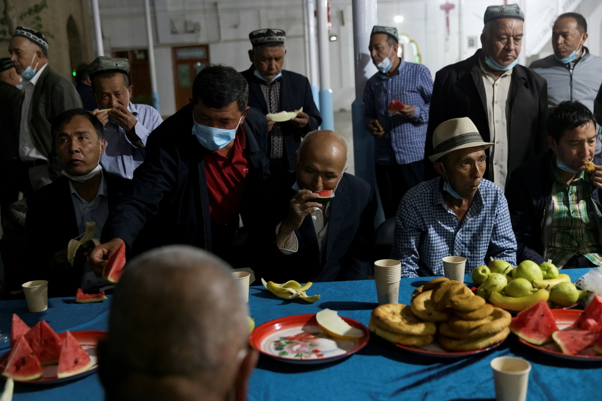 While reporters were there, several dozen men, most of them elderly, came to pray as dusk fell. Afterwards, they broke their fast with food provided by the local government.
