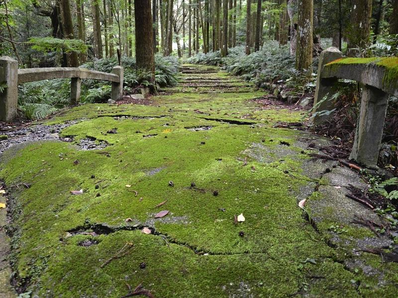 The path leading to Ginzanjo Shrine is covered with brilliant green moss that can provide visitors a healing comfort in Tsushima, Nagasaki Prefecture.