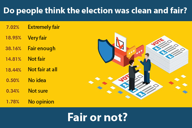 Asked whether they thought the election was clean and fair, 7.02% said yes, absolutely; 18.95% said yes, to a high degree; and 38.16% yes, to a moderate degree. Of the rest, 14.81% said the election was not very fair and 18.44% said it wasn't fair at all, while the others were uncertain or had no comment.