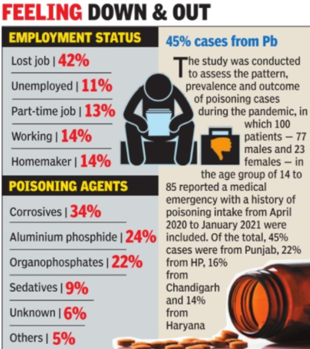 CHANDIGARH : Most people who consumed poison in the region during the Covid-19 pandemic had lost their jobs, according to a study by the Post Graduate Institute of Medical Education and Research (PGIMER), Chandigarh.