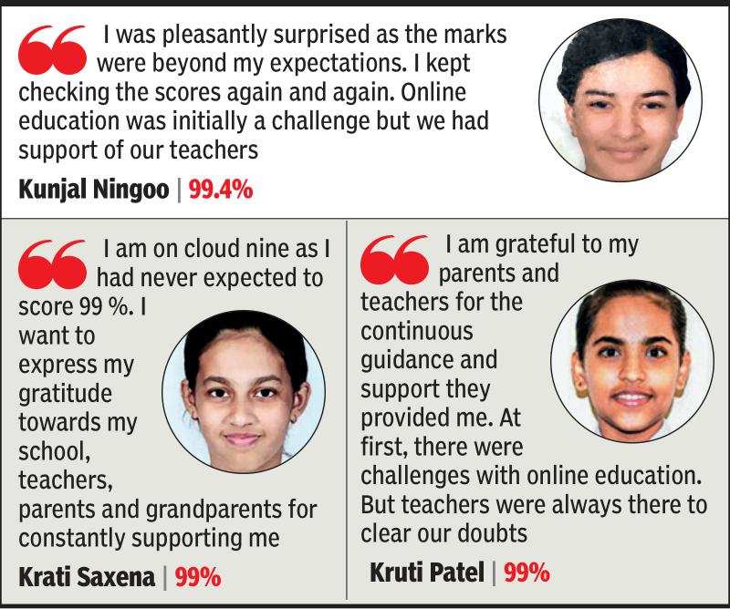 Vibgyor High International School had 87 students of which 26 secured 90% and above and 30 secured 80-89%, said Kavita Sahay Kerawalla, vice-chairperson of Vibgyor group of schools, adding that Jyot Ambalal Senghani topped with 96.4%. Of 51 students at Podar World School, Sherkhi 40% secured above 90%, 46% students secured 80% and above. Harshit Saxena topped with 97.4%. The overall school aggregate of DPS, Harni which had 216 students stood at 84.46%. Ved Markandey scored the highest at 98.8%.