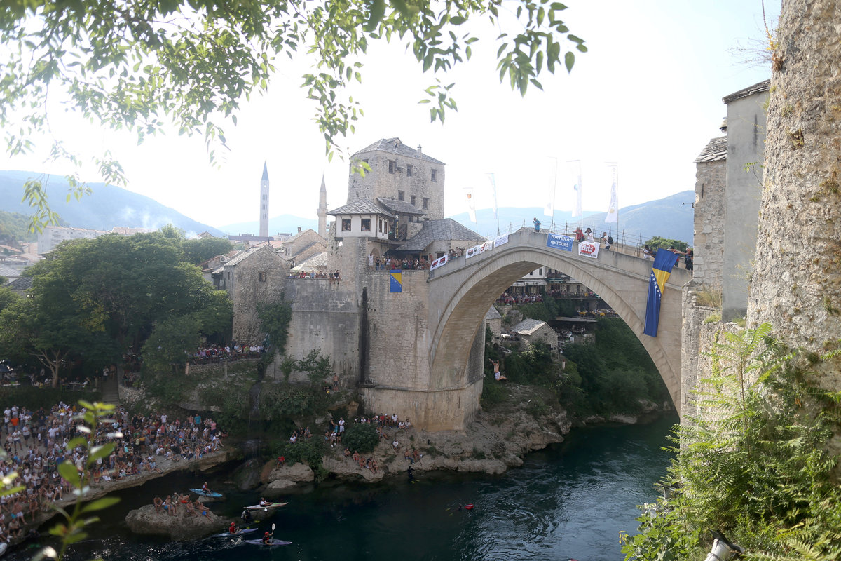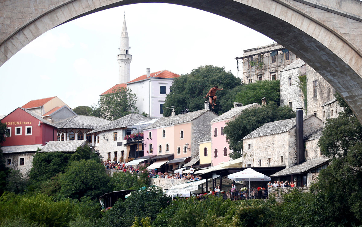 To this day, the 'swallow dive' that Celebi celebrated is still performed by Mostar's divers - although Petrovic took a safer option, jumping in feet-first.