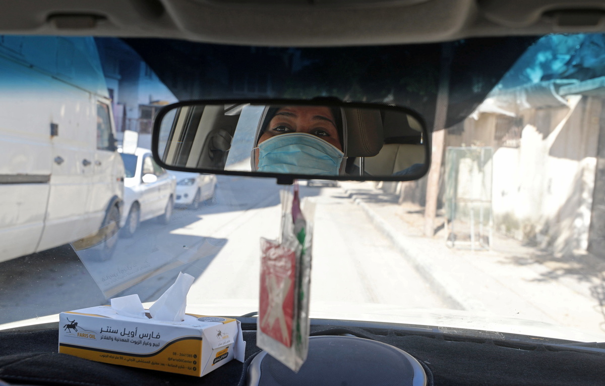 Wearing a headscarf and a COVID-19 mask, Abu Jibba drives an off-white Kia and wears a vest with her Al-Mukhtara (Chieftain) taxi service's livery.