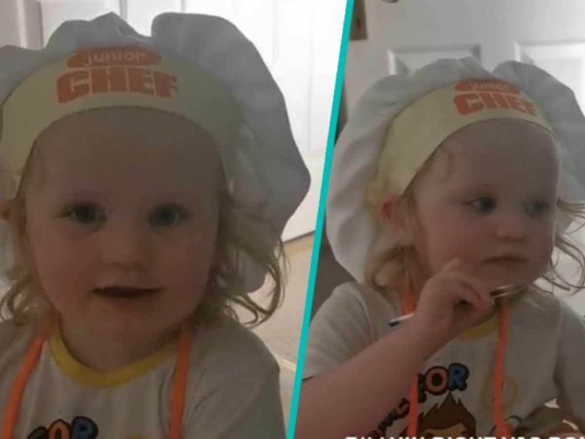 This small child was dressed as a junior chef for Mother's Day, complete with chef's hat and apron. What would you like for today, she questioned her mother while holding a pen in her small hand.