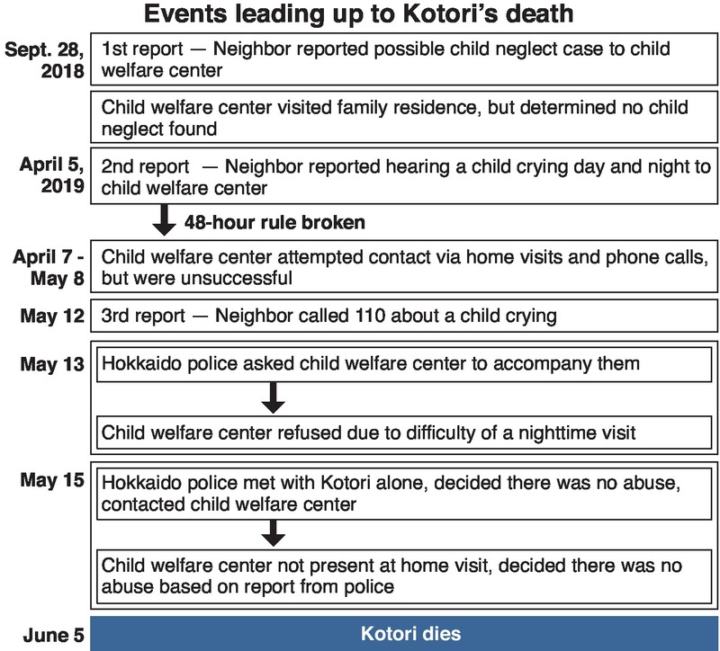 The Sapporo child welfare center and the prefectural police received three reports and observed signs of abuse, yet were unable to save the life of this young child.