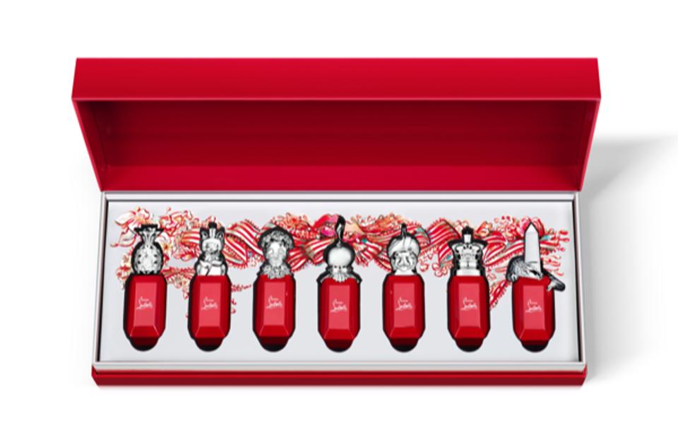 The 7-piece Loubiworld Miniatures collection is the famed cobbler’s first fragrance collection that takes you on a journey through is imagination. Each scent from the lightest to the most intense tells the story of a memory, a fantasy, and a dream. Each bottle lacquered with red has its own fantastical cap. The unisex fragrances reveal an influence in Louboutin’s imagination.