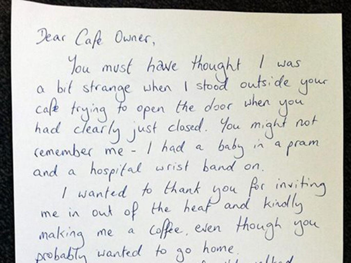 The note read: "Dear cafe owner, you must have thought I was a bit strange when I stood outside your café trying to open the door when you had clearly closed.