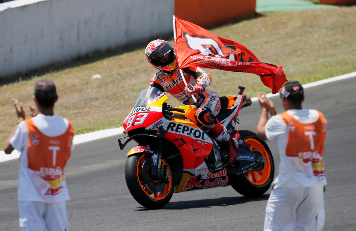 The Honda rider led from the first corner to chequered flag, heading a Spanish one-two-three with Suzuki's Alex Rins 1.654 seconds behind as runner-up and Maverick Vinales third for Yamaha.