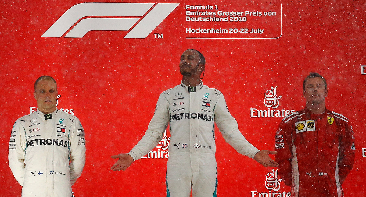Hamilton, the reigning world champion, took the chequered flag for a record-equalling fourth German Grand Prix win, ahead of his Finnish team mate Valtteri Bottas and Ferrari's Kimi Raikkonen.