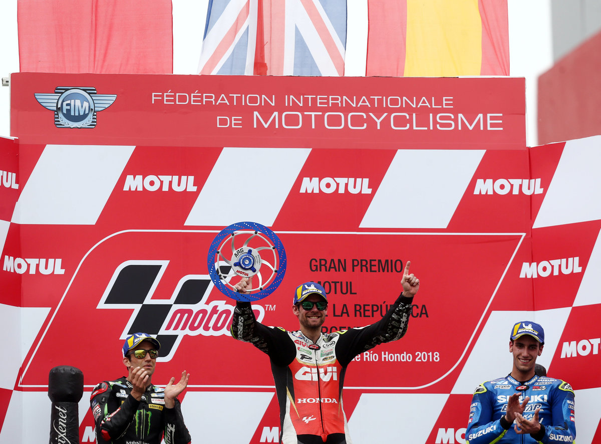 Motorcycle Racing - Argentina Motorcycle Grand Prix - MotoGP race - Termas de Rio Hondo, Argentina - April 8, 2018 - LCR Honda Castrol rider Cal Crutchlow of Britain celebrates on the podium alongside Monster Yamaha Tech 3 rider Johann Zarco (L) of France and Team Suzuki Ecstar rider Alex Rins of Spain. REUTERS/Marcos Brindicci