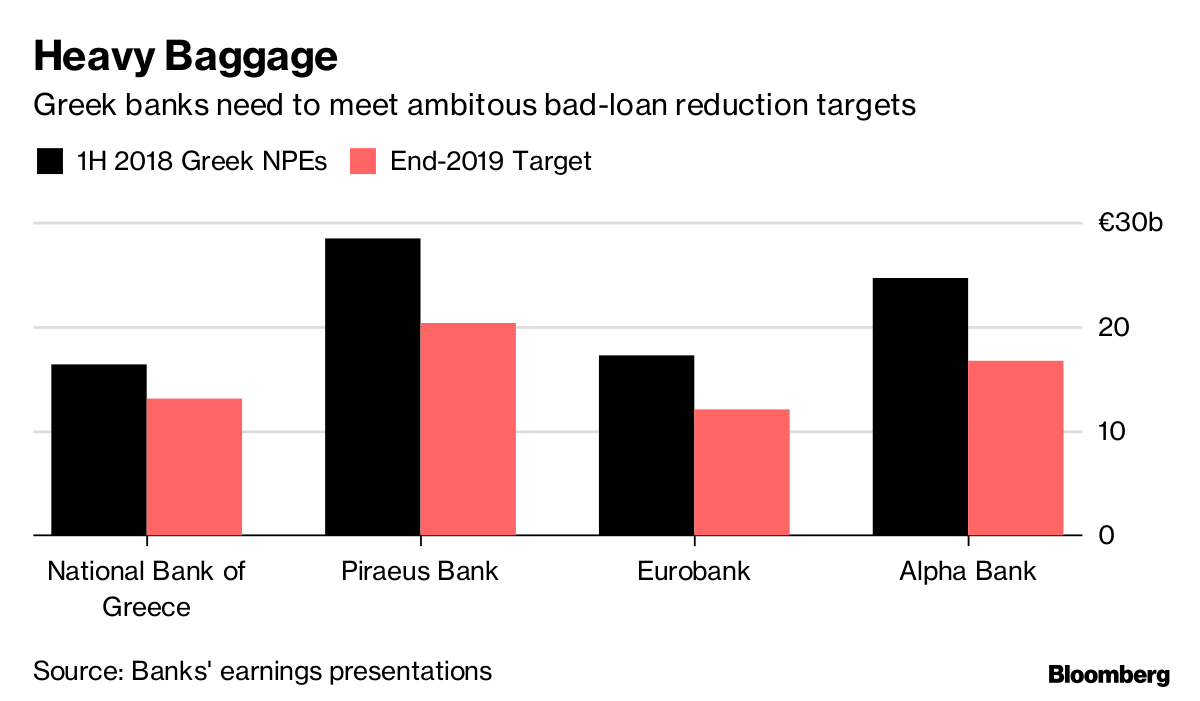 One of the biggest obstacles to providing that money is the ongoing legacy of the country’s debt crisis that forced it to seek multiple international bailouts. Borrowers are failing to meet payments on almost half the debt owed to Greece’s banks. In other words, there’s 88.6 billion euros ($101 billion) of bad loans weighing down the balance sheets of Greek lenders, equivalent to about half the country’s annual economic output.