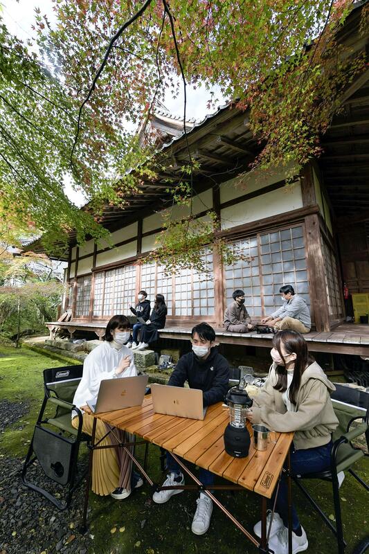 Within the tree-enclosed grounds of Jinzoji temple in Kameoka, Kyoto Prefecture, several desks, chairs, and portable Wi-Fi devices have been placed for teleworking. Young workers were seen looking into the displays of their personal computers, sitting wherever they like, such as under the eaves of the main building of the temple.