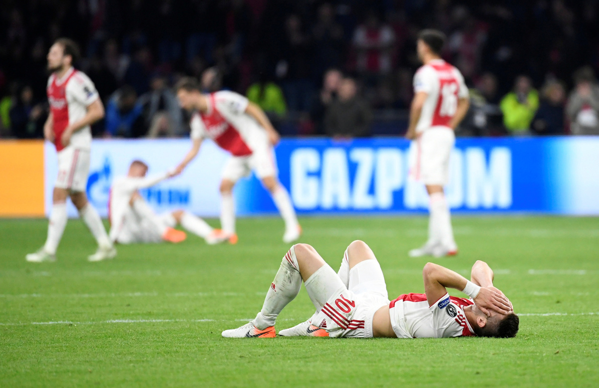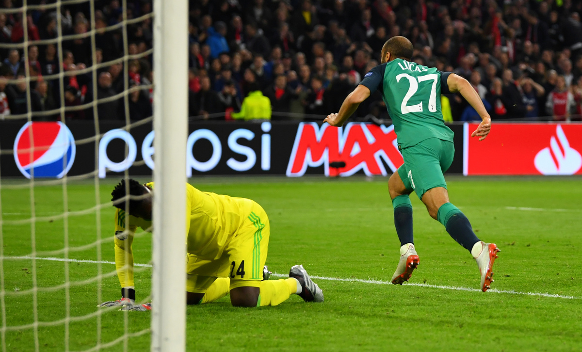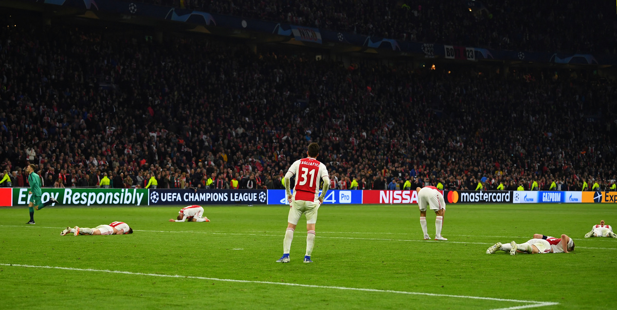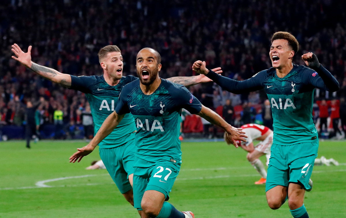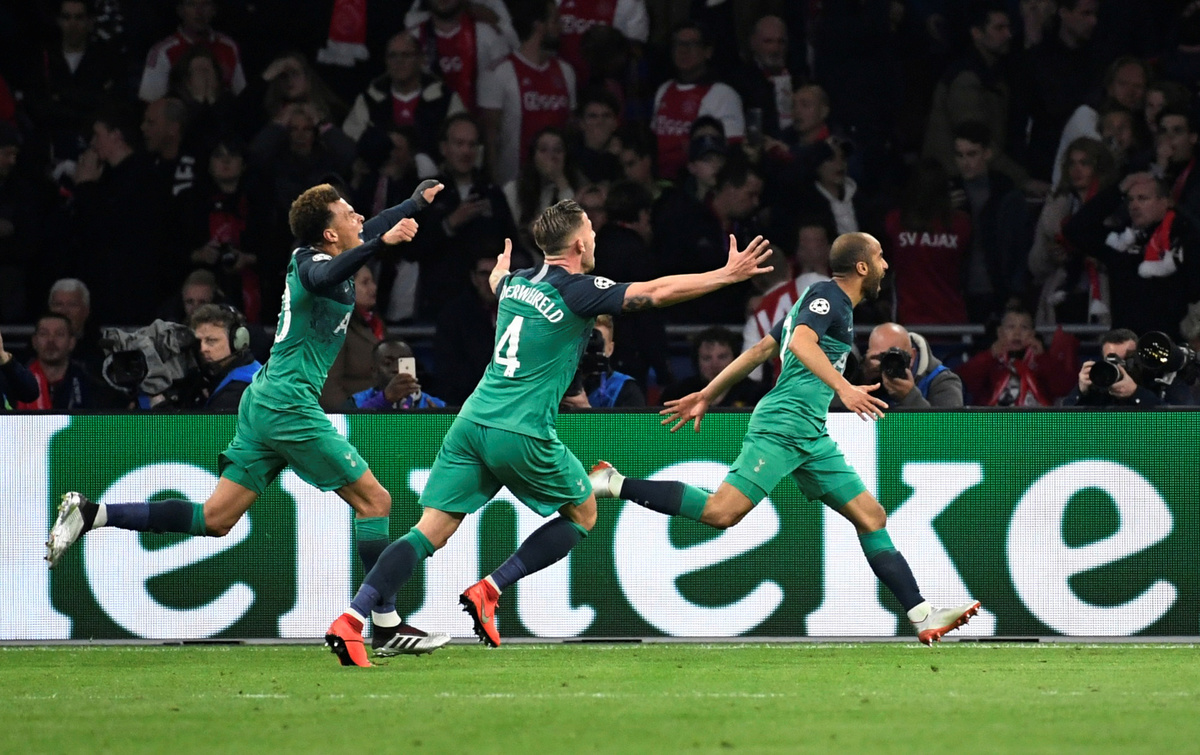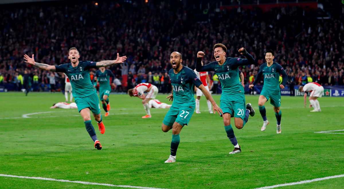 Soccer Football - Champions League Semi Final Second Leg - Ajax Amsterdam v Tottenham Hotspur - Johan Cruijff Arena, Amsterdam, Netherlands - May 8, 2019 Tottenham manager Mauricio Pochettino, Ben Davies, Fernando Llorente and Erik Lamela celebrate after the match Action Images via Reuters/Matthew ChildsSoccer Football - Champions League Semi Final Second Leg - Ajax Amsterdam v Tottenham Hotspur - Johan Cruijff Arena, Amsterdam, Netherlands - May 8, 2019 Tottenham's Lucas Moura celebrates scoring their third goal to complete his hat-trick with Dele Alli and Toby Alderweireld Action Images via Reuters/Matthew ChildsSoccer Football - Champions League Semi Final Second Leg - Ajax Amsterdam v Tottenham Hotspur - Johan Cruijff Arena, Amsterdam, Netherlands - May 8, 2019 Tottenham's Lucas Moura celebrates scoring their third goal to complete his hat-trick with Dele Alli and Toby Alderweireld REUTERS/Piroschka Van De WouwSoccer Football - Champions League Semi Final Second Leg - Ajax Amsterdam v Tottenham Hotspur - Johan Cruijff Arena, Amsterdam, Netherlands - May 8, 2019 Tottenham's Lucas Moura celebrates scoring their third goal to complete his hat-trick with Dele Alli, Toby Alderweireld and Son Heung-min Action Images via Reuters/Matthew ChildsSoccer Football - Champions League Semi Final Second Leg - Ajax Amsterdam v Tottenham Hotspur - Johan Cruijff Arena, Amsterdam, Netherlands - May 8, 2019 Ajax's Dusan Tadic looks dejected after the match REUTERS/Piroschka Van De WouwSoccer Football - Ajax Amsterdam fans react during the Champions League Semi Final Second Leg in Amsterdam - Ajax Amsterdam v Tottenham Hotspur - Amsterdam, Netherlands - May 8, 2019 An Ajax fan looks dejected during the match REUTERS/Pascal RossignolSoccer Football - Tottenham Hotspur fans react during the Champions League Semi Final Second Leg - Ajax Amsterdam v Tottenham Hotspur - The Bricklayers, Tottenham, London, Britain - May 8, 2019 Tottenham Hotspur fans react during the match Action Images via Reuters/Peter Cziborra