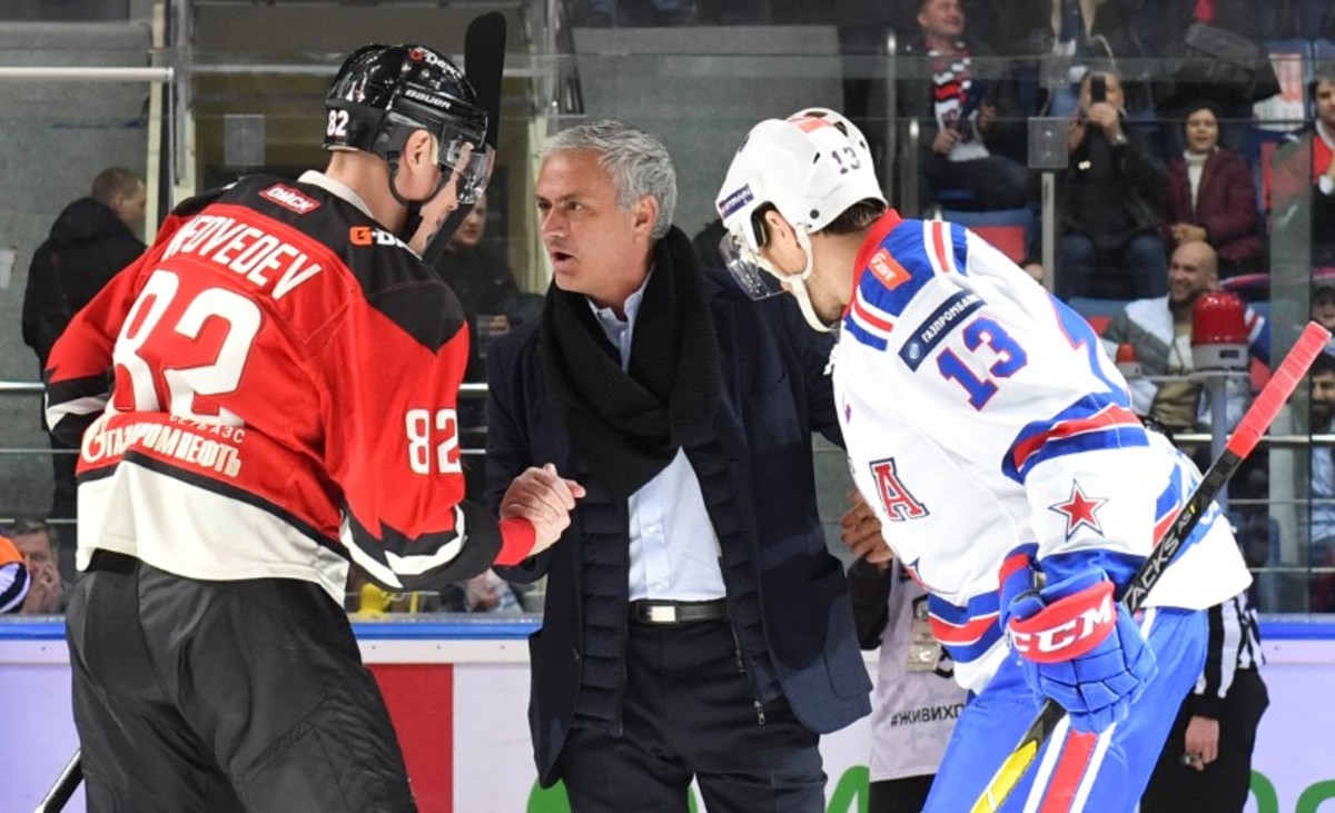 Mourinho, who was sacked by United in December, made the first puck drop of the Kontinental Hockey League (KHL) game between Avangard Omsk and SKA Petersburg, two of the league's best teams, at an arena in Balashikha.