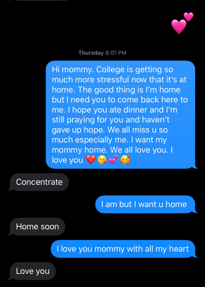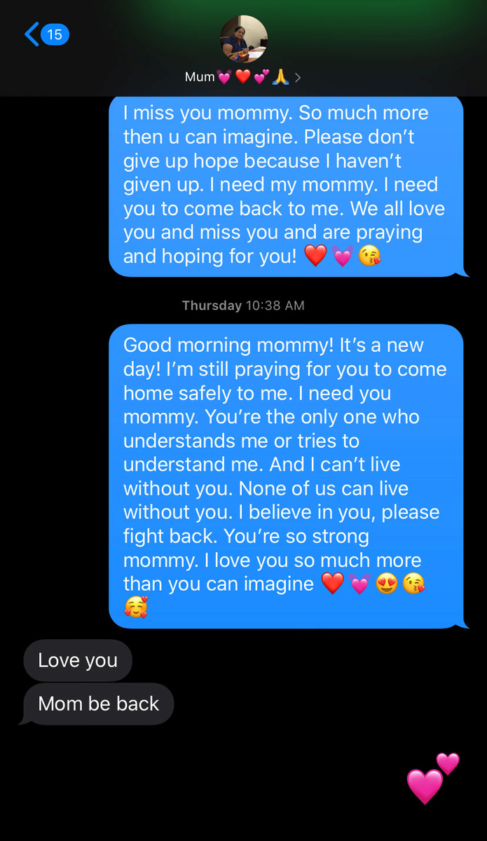 "I'm still praying for you to come home safely to me. I need you Mommy," Minnoli texted on March 25. "None of us can live without you. I believe in you, please fight back. You're so strong mommy. I love so much more than you can imagine."