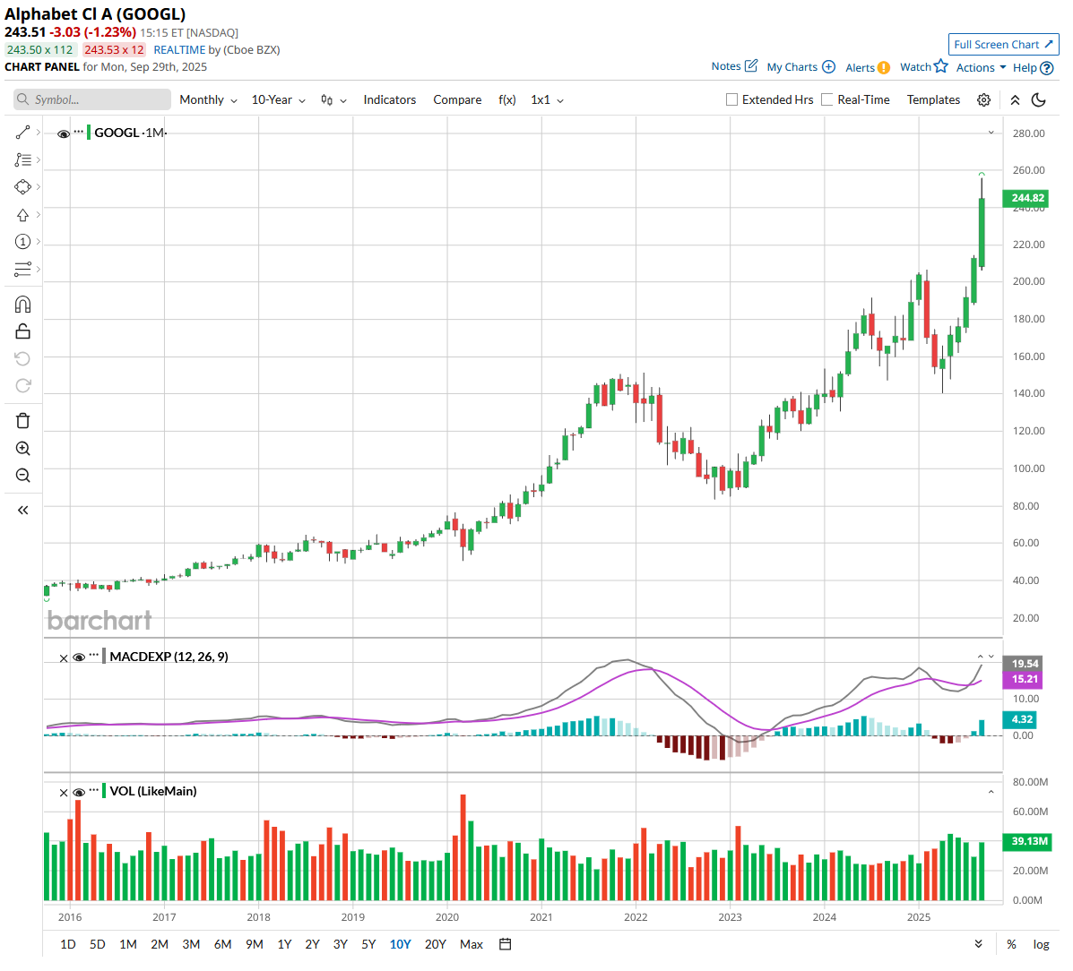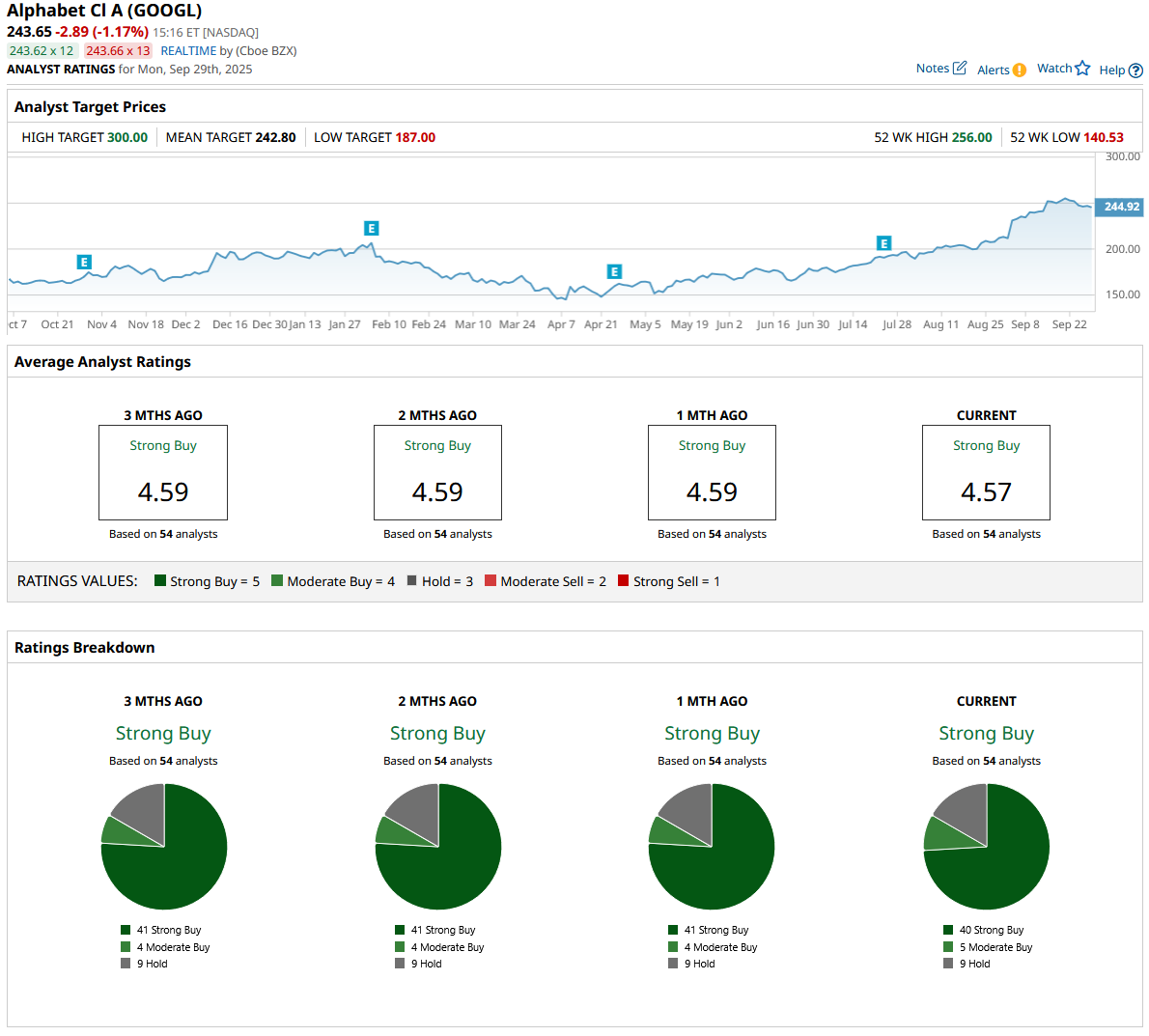 Out of the 54 analysts covering GOOGL stock, 40 recommend “Strong Buy,” five recommend “Moderate Buy,” and nine recommend “Hold.” The average GOOGL stock price target is $242.80, which is a hair below the current trading price of $243.