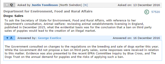 Environment Secretary Andrea Leadsom announced tougher licensing regulations for breeders and third party sellers in response to the committee's findings.