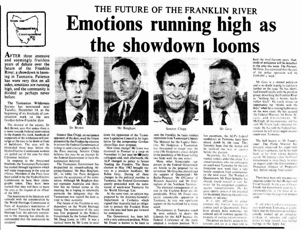 Tasmania in 1982 was a state divided: There was escalating protest action against a Hydro Electric Commission (HEC) plan to build a dam on the Gordon River, flooding 35 kilometres of the Franklin River in the state's south-west.