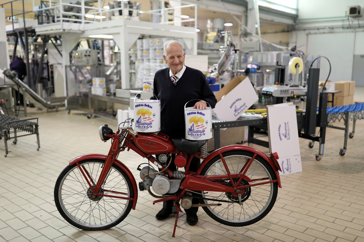 Cesar Bonilla, 87, poses for a portrait next to his motorcycle, which he used to distribute potatoes around the city of Coruna, inside Bonilla a la Vista factory in Arteixo, near Coruna, Spain February 17, 2020. Picture taken February 17, 2020. REUTERS/Nacho Doce