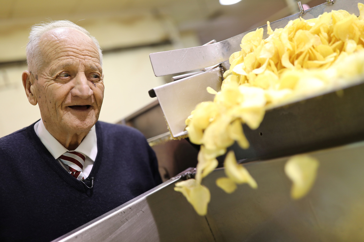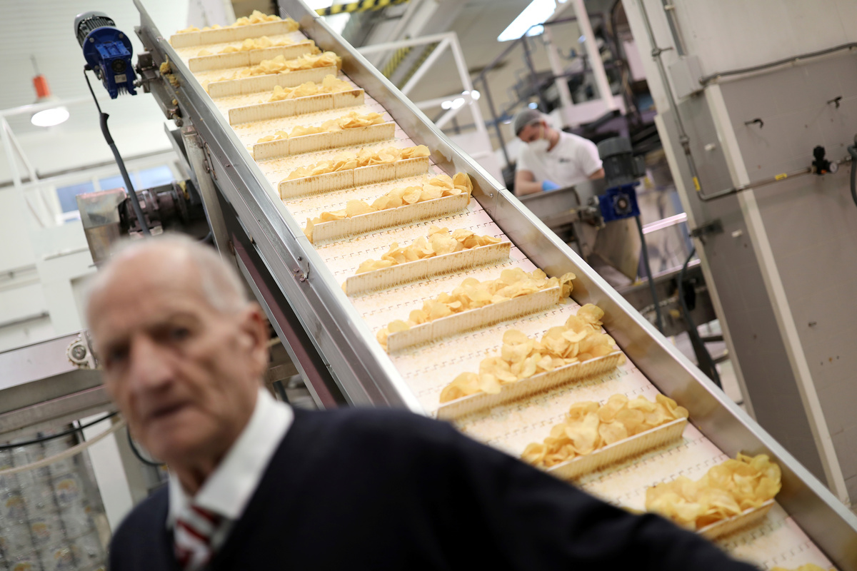 Owner Cesar Bonilla, 87, looks at potato chip production during an interview with Reuters inside his Bonilla a la Vista factory in Arteixo, near Coruna, Spain February 17, 2020. REUTERS/Nacho Doce