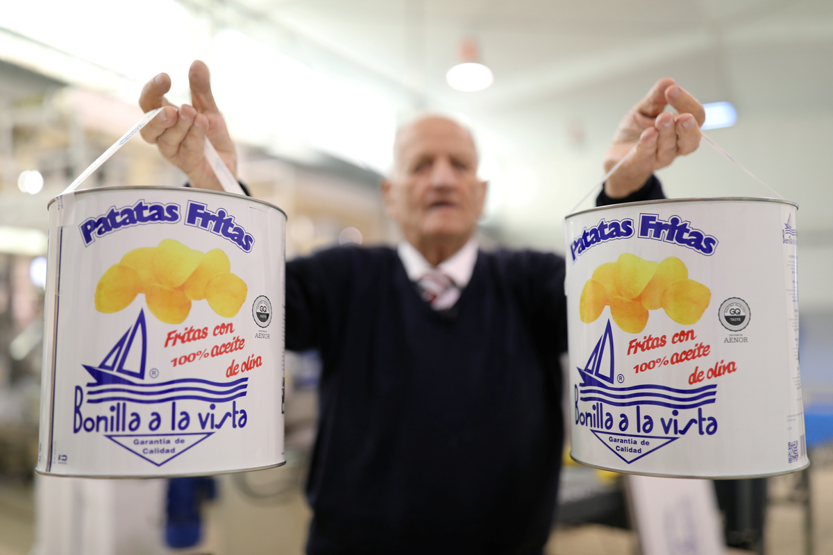 A worker arranges potato chips inside the Bonilla a la Vista factory in Arteixo, near Coruna, Spain February 17, 2020. REUTERS/Nacho DoceA worker holds a pallet jack next to cans of potato chips inside Bonilla a la Vista factory in Arteixo, near Coruna, Spain February 17, 2020. REUTERS/Nacho DoceA worker carries cans of potato chips inside Bonilla a la Vista factory in Arteixo, near Coruna, Spain February 18, 2020. REUTERS/Nacho DoceA worker wipes a can of potato chips inside Bonilla a la Vista factory in Arteixo, near Coruna, Spain February 18, 2020. REUTERS/Nacho DoceA worker weighs a can of potato chips inside Bonilla a la Vista factory in Arteixo, near Coruna, Spain February 17, 2020. REUTERS/Nacho DoceOwner Cesar Bonilla, 87, poses as he holds cans of potato chips during an interview with Reuters inside his Bonilla a la Vista factory in Arteixo, near Coruna, Spain February 17, 2020. REUTERS/Nacho DoceAn employee looks at owner Cesar Bonilla, 87, during an interview with Reuters inside his Bonilla a la Vista factory in Arteixo, near Coruna, Spain February 17, 2020. REUTERS/Nacho DoceA worker arranges potato chips inside the Bonilla a la Vista factory in Arteixo, near Coruna, Spain February 18, 2020. REUTERS/Nacho DoceOwner Cesar Bonilla, 87, stands near potato chip production during an interview with Reuters inside his Bonilla a la Vista factory in Arteixo, near Coruna, Spain February 17, 2020. REUTERS/Nacho DoceCans of potato chips are pictured inside the Bonilla a la Vista factory in Arteixo, near Coruna, Spain February 18, 2020. REUTERS/Nacho Doce