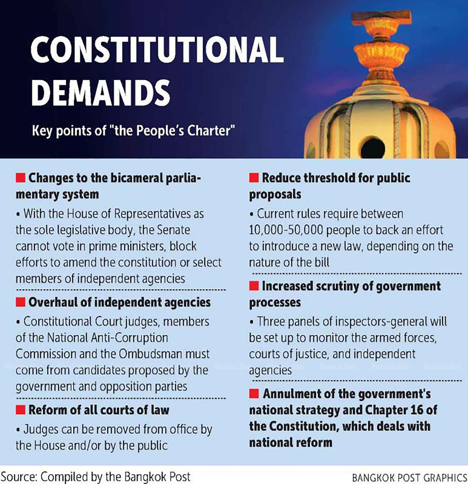 The charter proposal seeks to abolish the Senate, which is seen as the proxy of the now-dissolved National Council for Peace and Order (NCPO). It also seeks to increase the MPs and the opposition's power to scrutinise government actions.