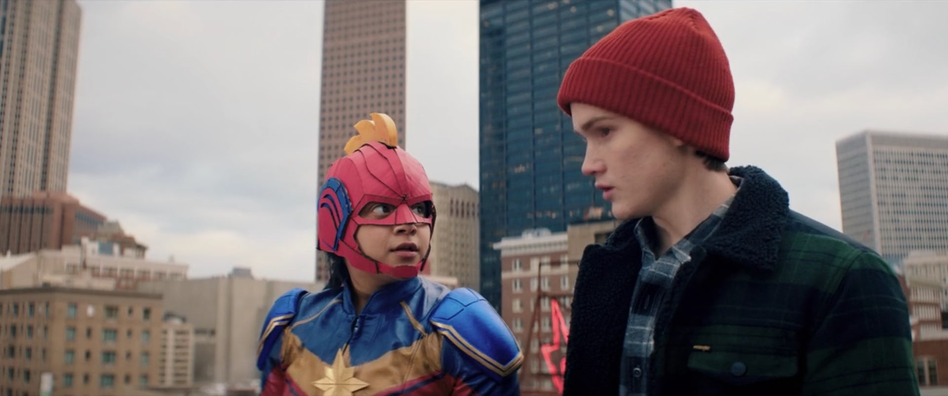 The trailer only fleetingly alludes to the character’s powers. A brief scene is shown of Kamala standing on the edge of a rooftop in her homemade costume, and the teaser subsequently ends with an on-the-ground shot of Kamala’s reflection gliding across the glass windows of a building as she, apparently, runs weightless through the air. (This is a new power the character doesn’t have in the comics.)