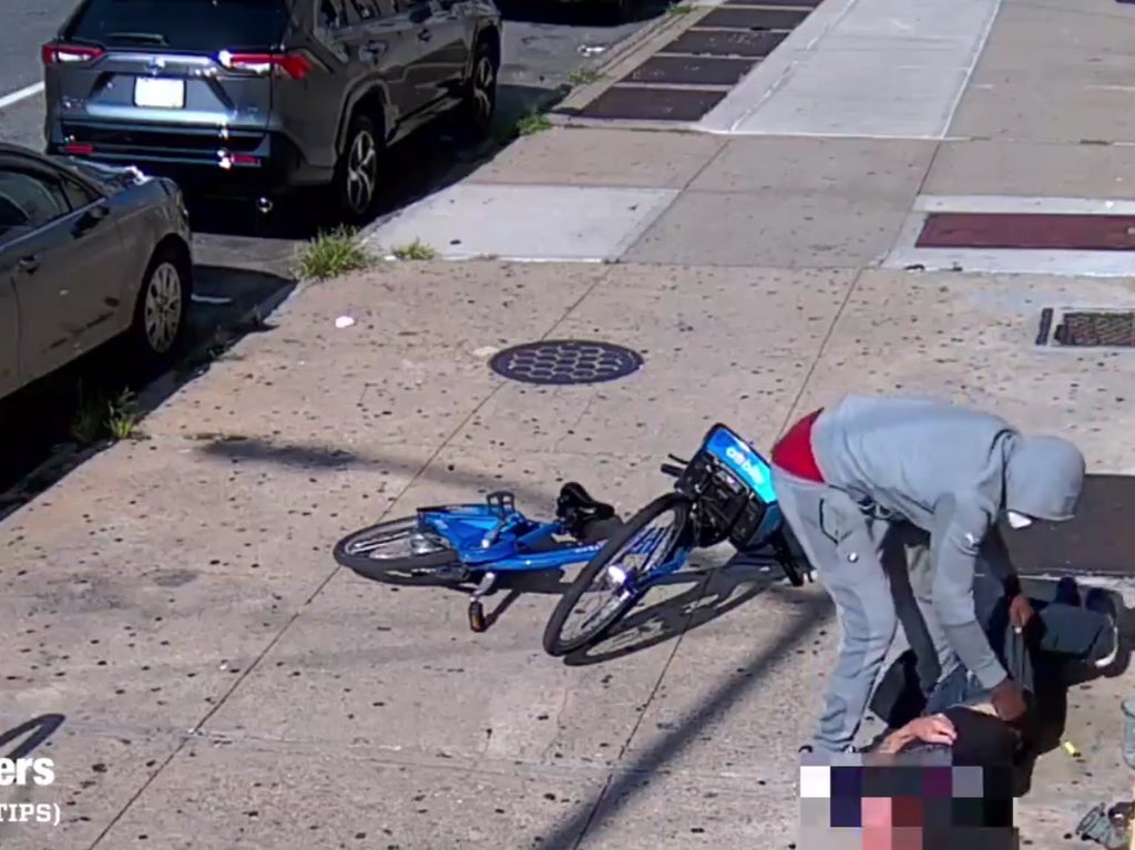CCTV footage released by the Crime Stoppers unit on Saturday shows a man in a grey hoodie violently punching a victim who appeared to have been thrown from his Citi bike, which could be seen by his side.