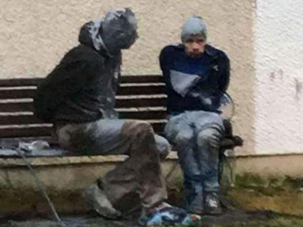 Two men wanted by police were tied to a bench by vigilantes and covered in paint.