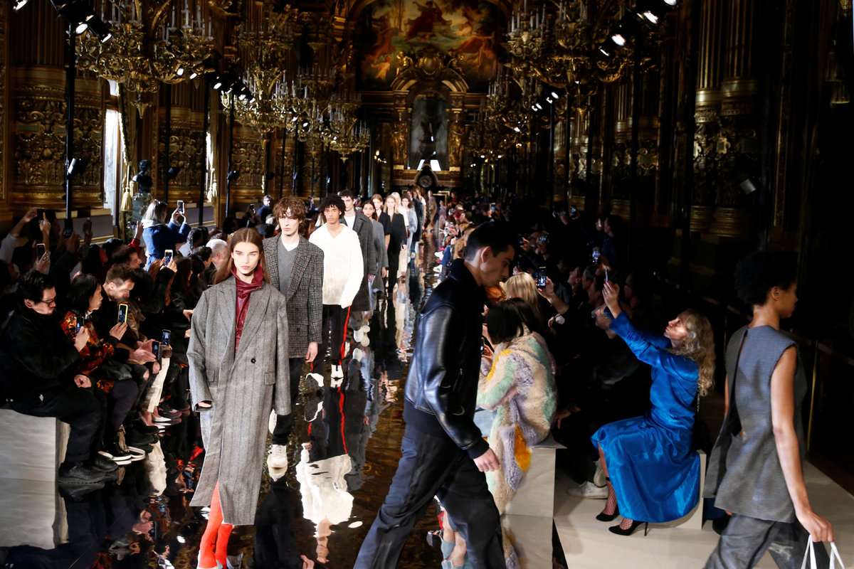 The label's latest runway show - the first to mix men and women's clothing - featured an edgy take on suits, with waistcoasts revealing a bare back, layered shorts over trousers cut from the same cloth, and linings worn as sleeves.