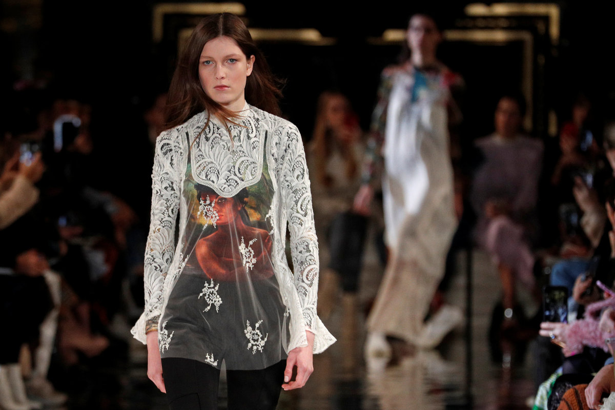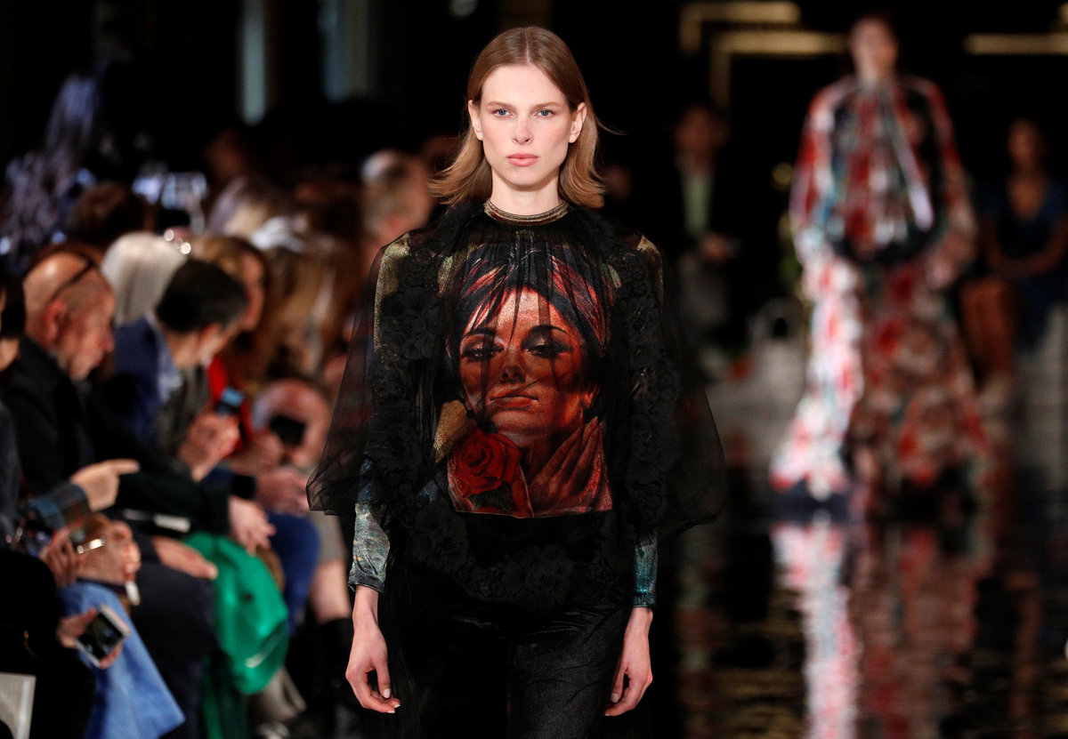 Looks for next winter included knitwear, such as a chunky striped poncho with layers of different yarns, and dresses in stretchy velour etched with prints from 20th century British artist J.H. Lynch, known for his paintings of sultry women.