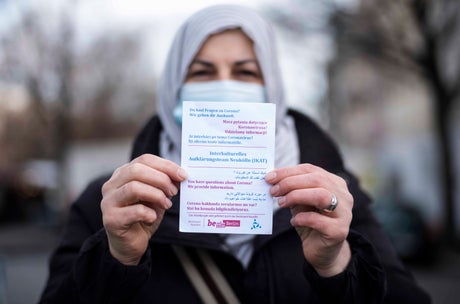 Three times a week, Aliye Tuerkyilmaz hits the markets and busy shopping streets of Neukoelln to hand out informational flyers on the coronavirus pandemic to residents of the German capital's crowded immigrant neighborhood that's studded with minarets, kebab stores and hookah lounges.
