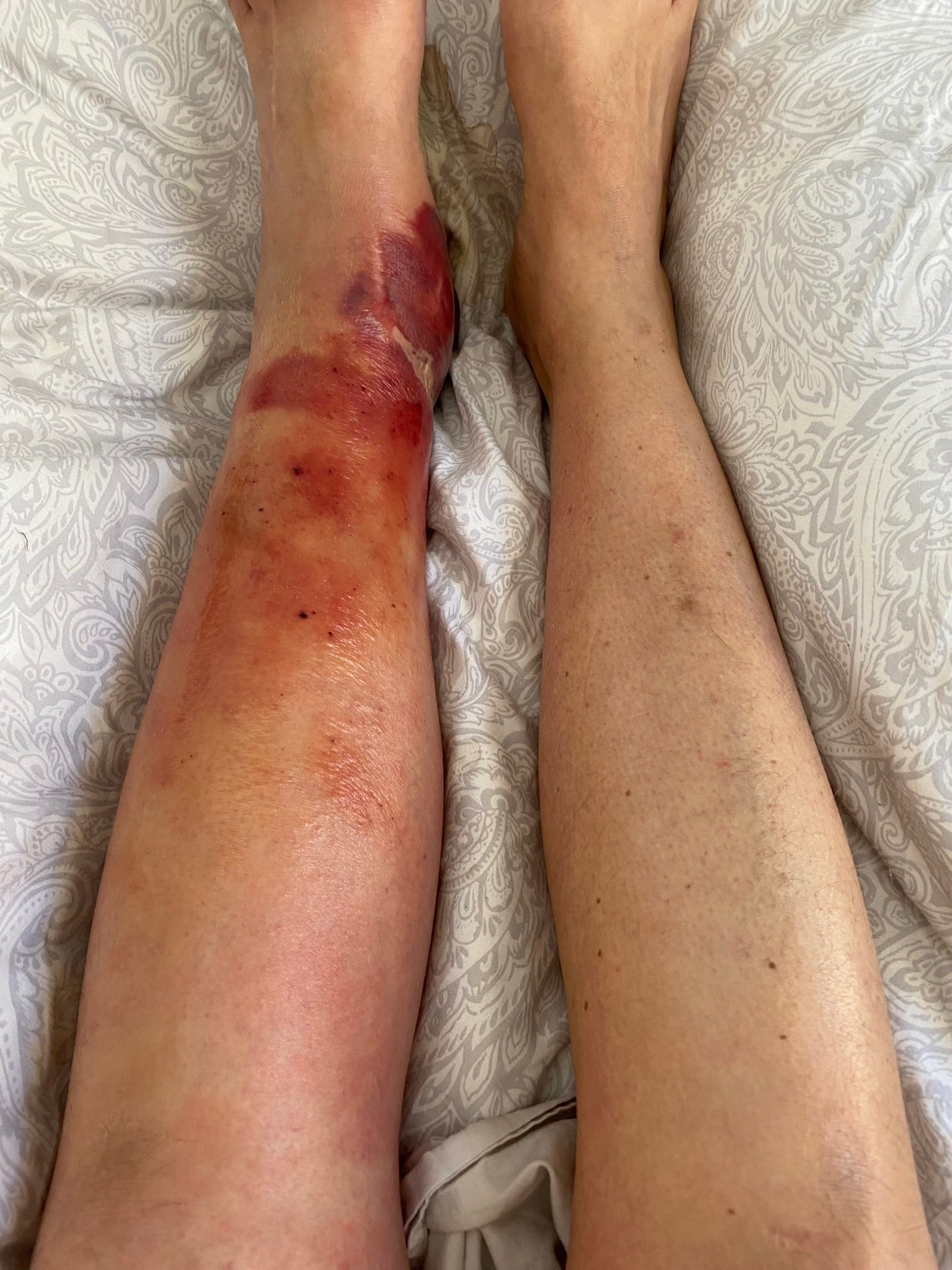 The following day, she collapsed on her bathroom floor and the day after that, the skin on her ankle “completely changed” and looked “dark and blood blistered”.