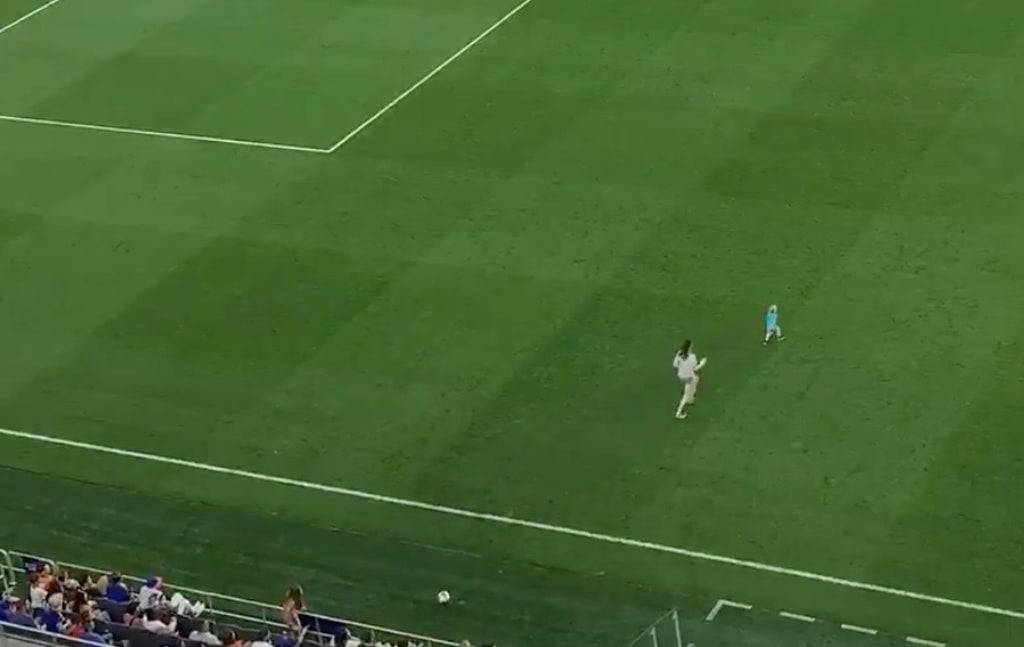 A mum was forced to run onto the pitch at a Major League Soccer game to slide tackle her pitch-invading toddler.
