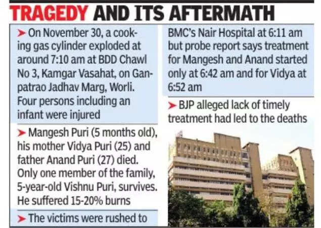 MUMBAI: There was a delay of around 40 minutes in giving treatment to victims of the World cylinder blast last month at the BMC-run Nair Hospital. An interim report submitted to the BMC revealed that while the four burns victims were brought to the hospital at around 6:11 am, actual treatment only began at 6:42 am for two of them and 6:52 am for another.