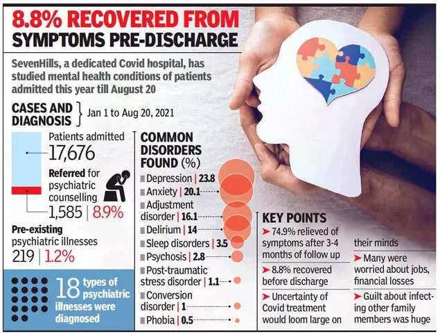 MUMBAI: Almost 7% of patients admitted with Covid-19 developed a mental health issue—such as depression, anxiety, psychosis, post-traumatic stress disorder—which warranted counselling and treatment, a study by the civic-run SevenHills Hospital has revealed.