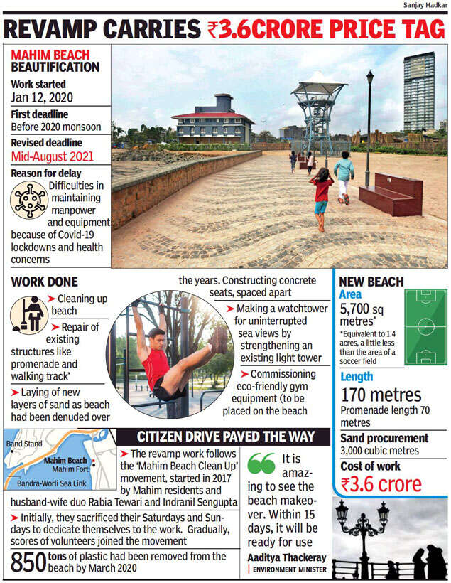 MUMBAI: Mahim Reti Bunder, a dumpyard till a few years ago, has been cleaned and majorly worked upon by the BMC to turn it into an accessible open space. The stretch now has a new layer of clean sand, a British-era promenade that has been repaired and placed with benches, a watchtower offering uninterrupted views of the sea and also equipment for exercising.