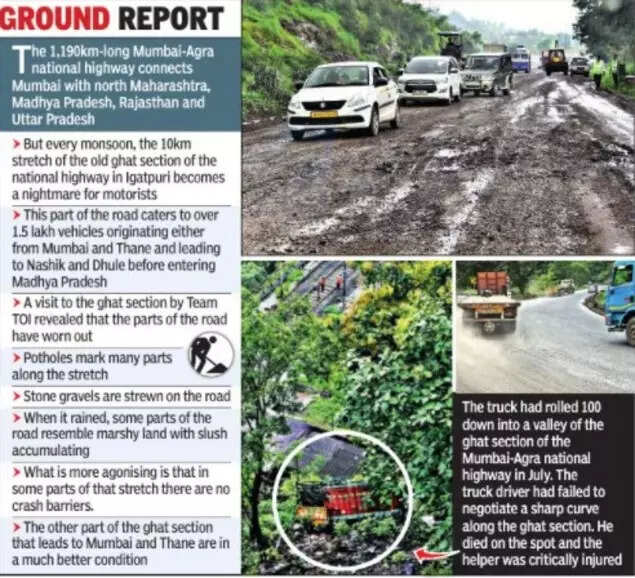 A visit to the ghat section by team TOI revealed that the parts of the road have worn out and potholes mark many parts of the stretch. Stone gravel is strewn all over the road. And when it rains, some parts of the road look like marshy land with slush making the road all the more dangerous. What is more agonising is the absence of crash barriers in some parts of the highway stretch.