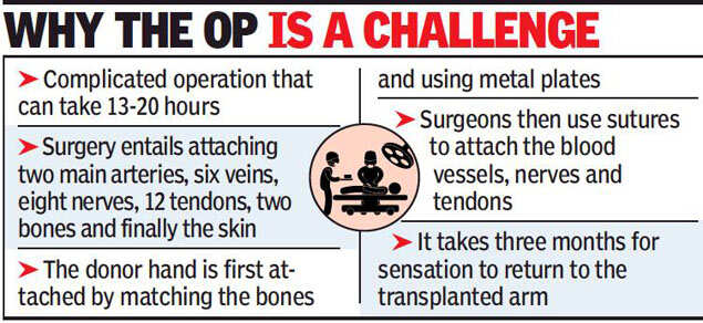 Doctors said the first 24 hours and then the next seven to 10 days are extremely crucial for the recipient. KEM dean Dr Hemant Deshmukh said they carried out a single hand transplant as the second hand didn’t appear viable to be transplanted. “Doctors have transplanted his right hand (elbow down). The first 24 hours are crucial as transplant patients may face acute rejection,” said the dean, adding that the transplant was seamless and made possible by a team effort that was shaping for years.