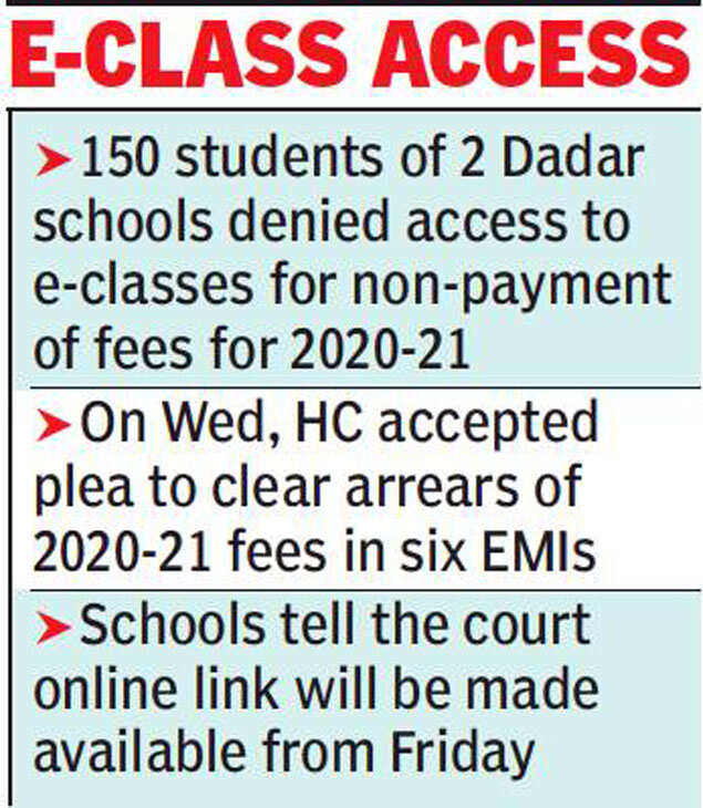 A bench of Justices Ramesh Dhanuka and Riyaz Chagla on Wednesday accepted their submission to clear arrears of 2020-21 fees in six equal monthly instalments beginning August 10. On July 20, the bench had told them to pay fees first and then move HC for online access. The petitioners had urged it to immediately allow classes, set aside fees fixed for 2020-21 and 2021-22 and to reduce it by 50%.