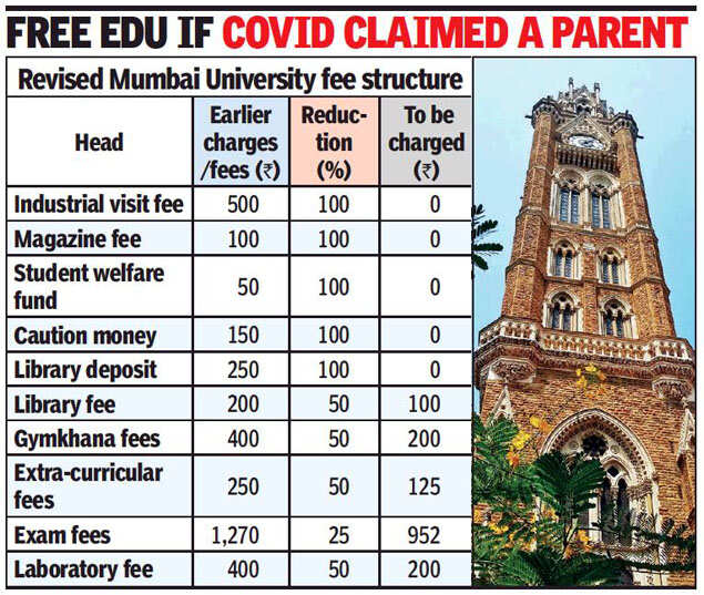 MUMBAI: Students seeking admission in undergraduate colleges across Mumbai University will benefit by around Rs 1,700 as fees and charges for various campus services have been reduced for 2021-22. Meanwhile, the university has announced 100% fee waiver for students who have lost either parent or both due to Covid-19.