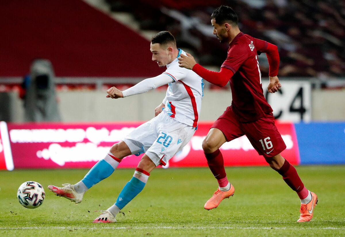Soccer Football - International Friendly - Qatar v Luxembourg - Nagyerdei Stadion, Debrecen, Hungary - March 24, 2021 Luxembourg's Edvin Muratovic in action with Qatar's Boualem Khoukhi REUTERS/Bernadett Szabo