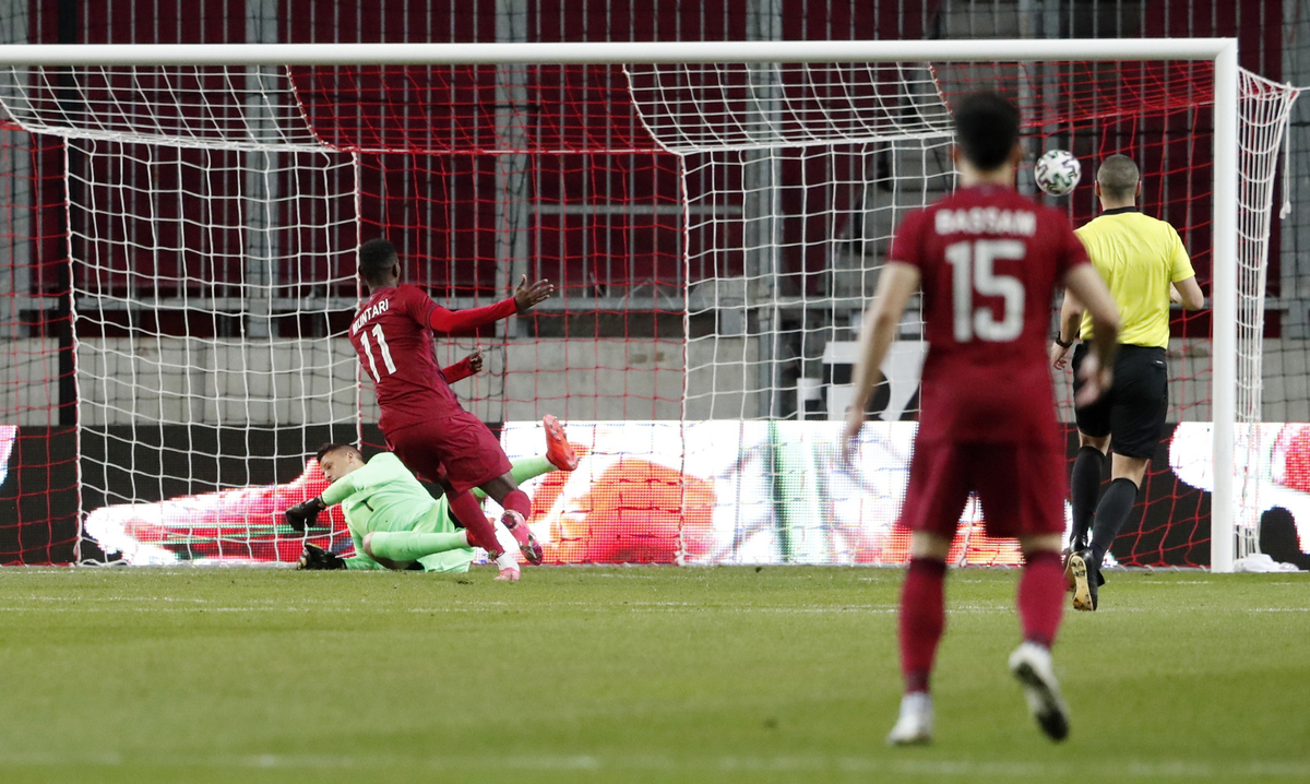 Soccer Football - International Friendly - Qatar v Luxembourg - Nagyerdei Stadion, Debrecen, Hungary - March 24, 2021 Qatar's Mohammed Muntari scores their first goal REUTERS/Bernadett Szabo