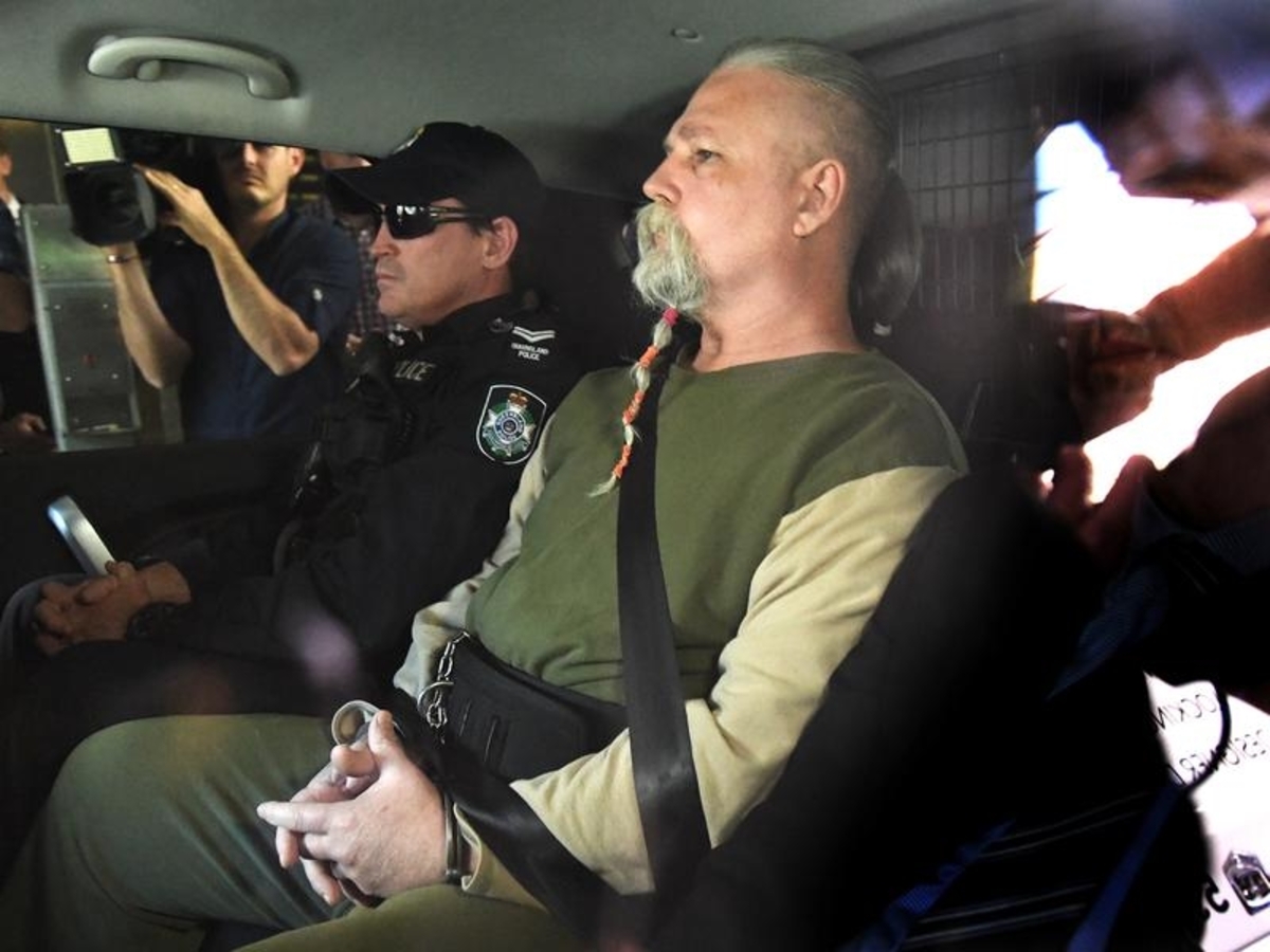 Just 17 at the time of the killing, the now 54-year-old appeared wearing thongs and a striped shit with his grey hair tied in a ponytail.