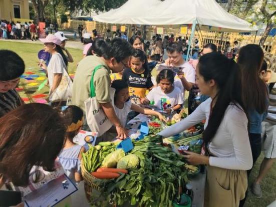 The green yard in front of the main three-storey neo-style building in Tha Tian next to the Chao Phraya River was transformed into four activity bases where children learnt about Thai food ingredients and how to cook them. Five of the country's favourite dishes were taught including tom yam kung (hot and spicy shrimp soup), som tam (hot and spicy papaya salad), green curry, bua loy (rice ball dessert with sweet coconut milk) and khai jiew (a Thai-style omelette).